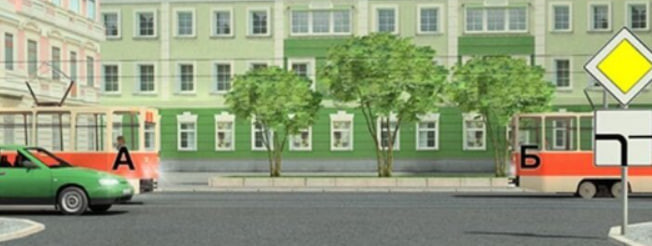 Так как один трамвай едет по главной дороге, второй — по второстепенной, мы, учитывая знаки, уступаем трамваю А. Трамвай Б уступает нам. Получается, что уступить мы должны лишь трамваю А.