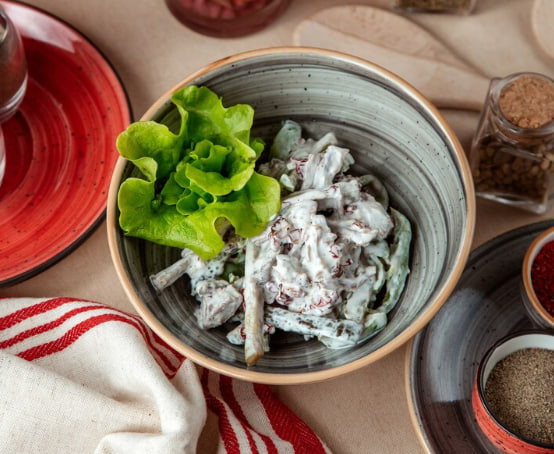 Нам потребуется доступный набор продуктов: 300 г говядины, 200 г шампиньонов, 1 луковица, 3 столовые ложки растительного масла, 100 г майонеза или сметаны, пучок любимой зелени, соль и перец.