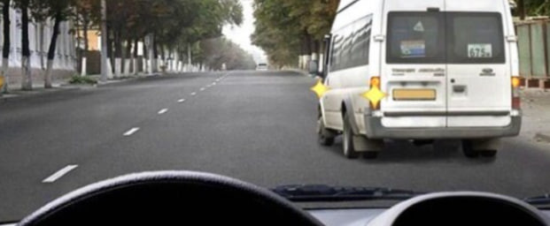 Итак, на изображении показан остановившийся микроавтобус — видимо, для посадки пассажиров. Остановки тут нет. Мы двигаемся по своей полосе, а водитель маршрутки, включив левый сигнал поворота, говорит нам, что начинает движение. Нужно ли ему уступить?