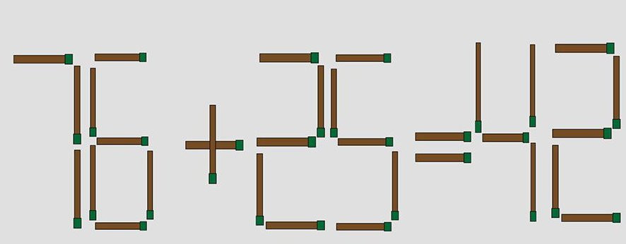 Итак, перед вами равенство: 76 + 25 = 42. Да, с ним определённо что-то не так. Однако у вас есть отличная возможность сделать его правильным, переставив всего одну спичку. При этом у вас есть только 12 секунд, так что расслабляться явно не стоит.