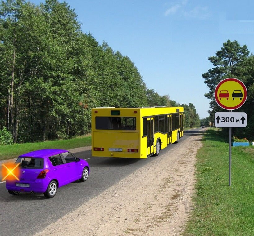 Табличка ниже уточняет, что действие запрещено на протяжении 300 метров. Автобус уже находится в этой зоне. Ответ очевиден: обгон выполнить нельзя.