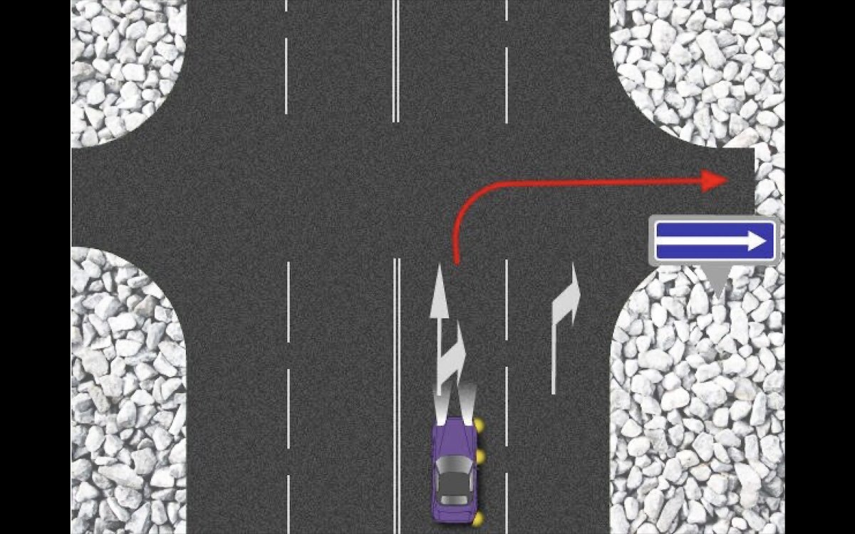 Взгляните на картинку: на ней изображён автомобиль, который стоит на левой крайней полосе и хочет повернуть направо на перекрёстке.