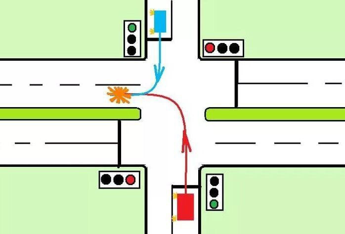 Давайте проверим свои знания. На картинке для обоих машин горит зелёный знак светофора, но случилось ДТП. Так кто же из них виноват?