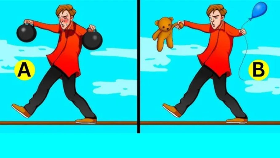 Итак, вам нужно внимательно рассмотреть изображение, на котором двое мужчин идут по канату. При этом один из них держит в каждой руке по гире, а второй несёт воздушный шарик и плюшевого медвежонка. Вам необходимо определить, кто из этих канатоходцев упадёт первым.