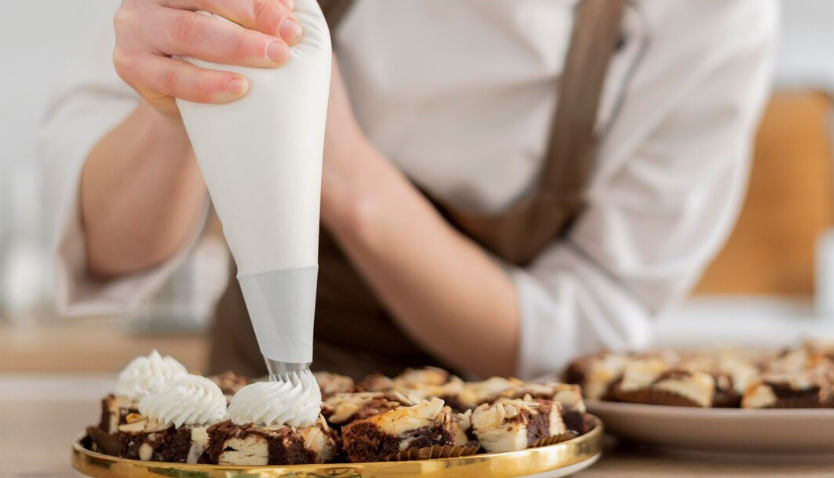 Остужаем, измельчаем обрезки. Пропитываем заготовки апельсиновым соком. Теперь приготовим крем. Выливаем в ёмкость холодные сливки, насыпаем сахарную пудру. Взбиваем сливки. Выкладываем сливки в кондитерский мешок, отсаживаем крем, посыпаем сверху пирожные крошкой.