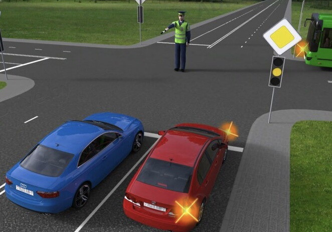 Такой сигнал регулировщика позволяет ехать автобусу во всех направлениях, то есть налево повернуть можно. Кроме того, поскольку водитель красной машины хочет повернуть направо, он также может это сделать.