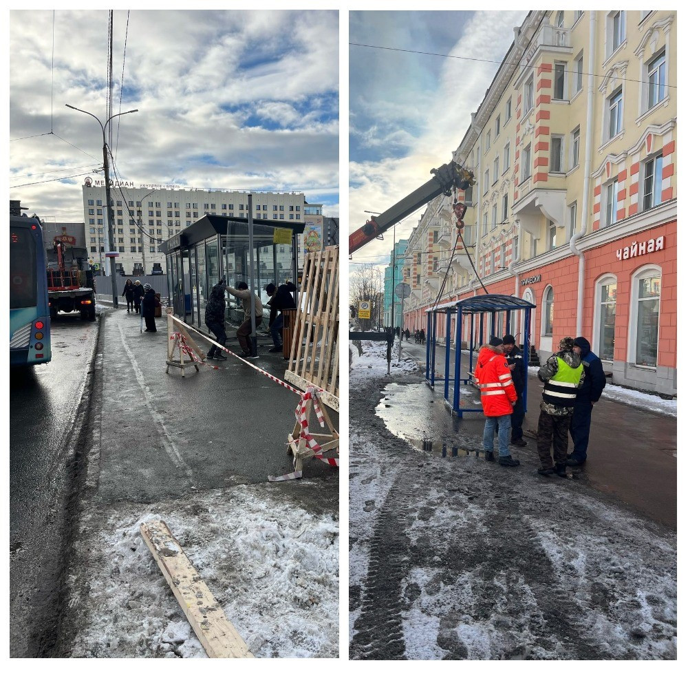 Перенос связан с необходимостью проведения строительно-монтажных работ по обустройству площади Пять Углов. "Тёплую" остановку у гостиницы "Арктика" демонтируют. Временный павильон установили возле дома №80 по проспекту Ленина.