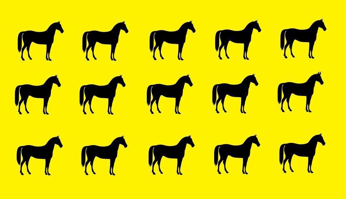 Взгляните на картинку ниже. Вы видите 15 силуэтов лошадей на желтом фоне. Две фигуры отличаются от других.