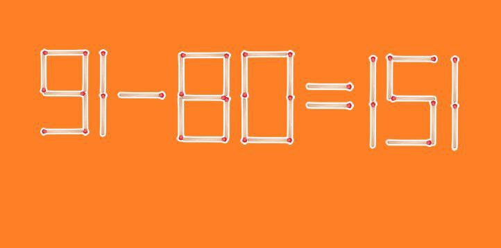 С помощью первой спички мы изменили 91 на 61. Вторую спичку забрали у восьмерки, превратив плюс в минус. Вуаля — равенство получилось верным.