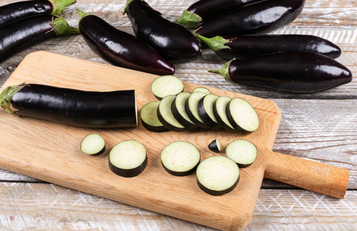 Баклажаны нужно промыть и порезать на тоненькие кружочки. Выложить в миску. Сначала посолить, перемешать, а после дать немножко отдохнуть. За это время баклажаны выпустят сок, а вместе с ним уйдет и горечь. А еще такие подсоленные отдохнувшие баклажанчики не почернеют. Для отдыха хватит минут 20. Промывать баклажаны не нужно, хватит и того, что сольете жидкость с нарезанных овощей.