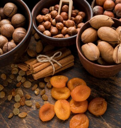 Чтобы приготовить начинку, нужно: 250 г сухофруктов, 150 г грецких орехов, 100 г сахара.