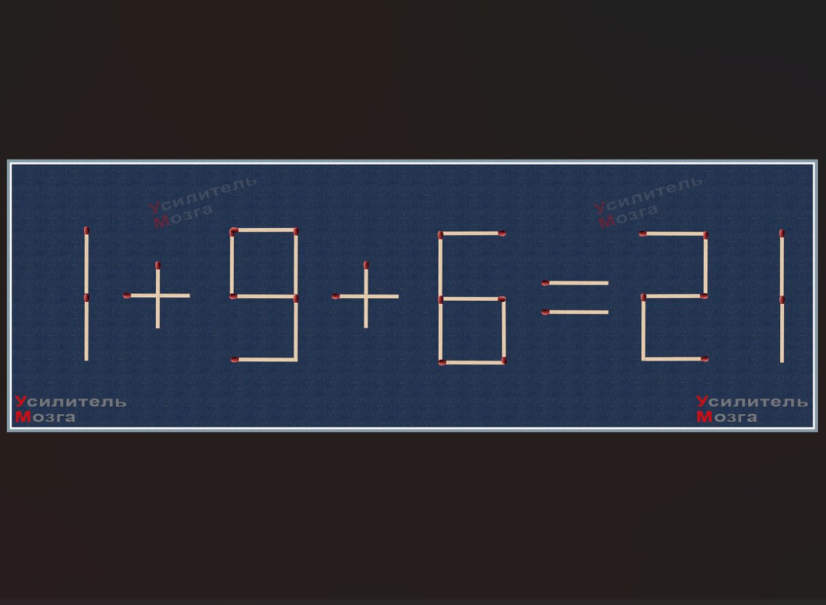 На картинке перед вами из спичек выложен пример, однако пока он некорректный. Переложите одну спичку, чтобы получить верное равенство.