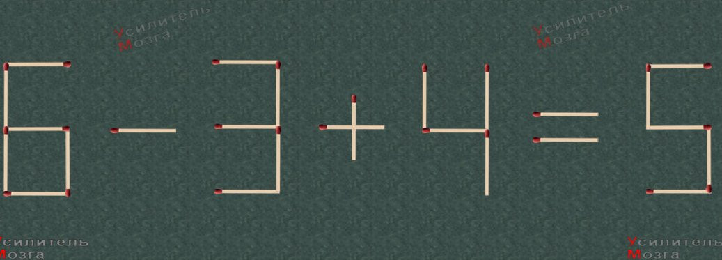 Так, на представленной карточке вы видите равенство: 6-3+4=5. Не нужно быть математиком, чтобы понять: с ним что-то не так. Вам нужно переставить спичку, и оно станет правильным. Отметим, что у вас будет достаточно времени подумать.