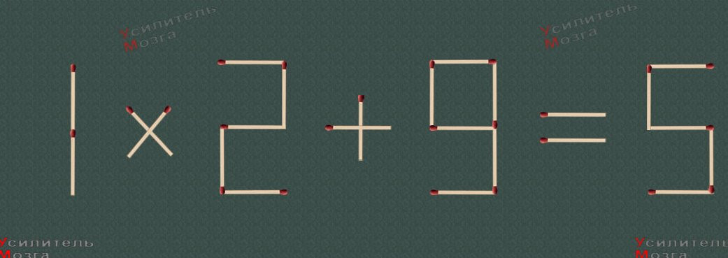 Итак, рассмотрите равенство: 1×2+9=5. Конечно, с первого взгляда видно, что с ним что-то не так. Переставьте только одну спичку — пример сразу преобразуется.
