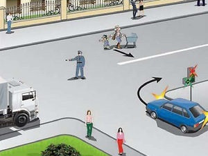 Итак, мы видим, что на перекрёстке стоит регулировщик — он руководит движением. Кроме того, имеется работающий светофор. Согласно ПДД, сигналы регулировщика находятся в приоритете над светофором.