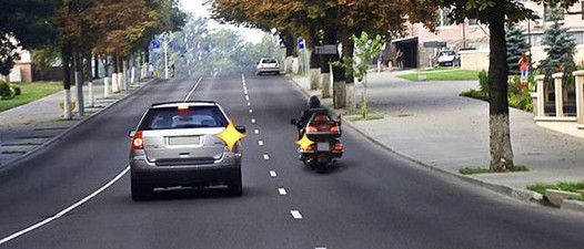 Итак, на нём видно, что автомобиль и мотоцикл едут по разным полосам попутного направления и хотят перестроиться в соседний ряд.