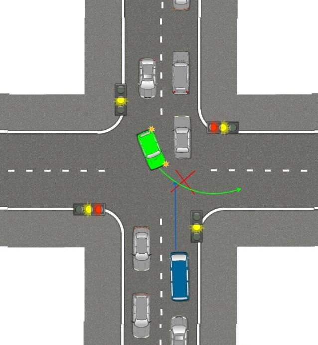 В этом случае нарушения правил не было, поскольку транспорт был на перекрёстке, так что сначала должен был уступить дорогу встречным машинам. Синий автомобиль ехал на жёлтый сигнал светофора, так что он противоречил правилам дорожного движения.
