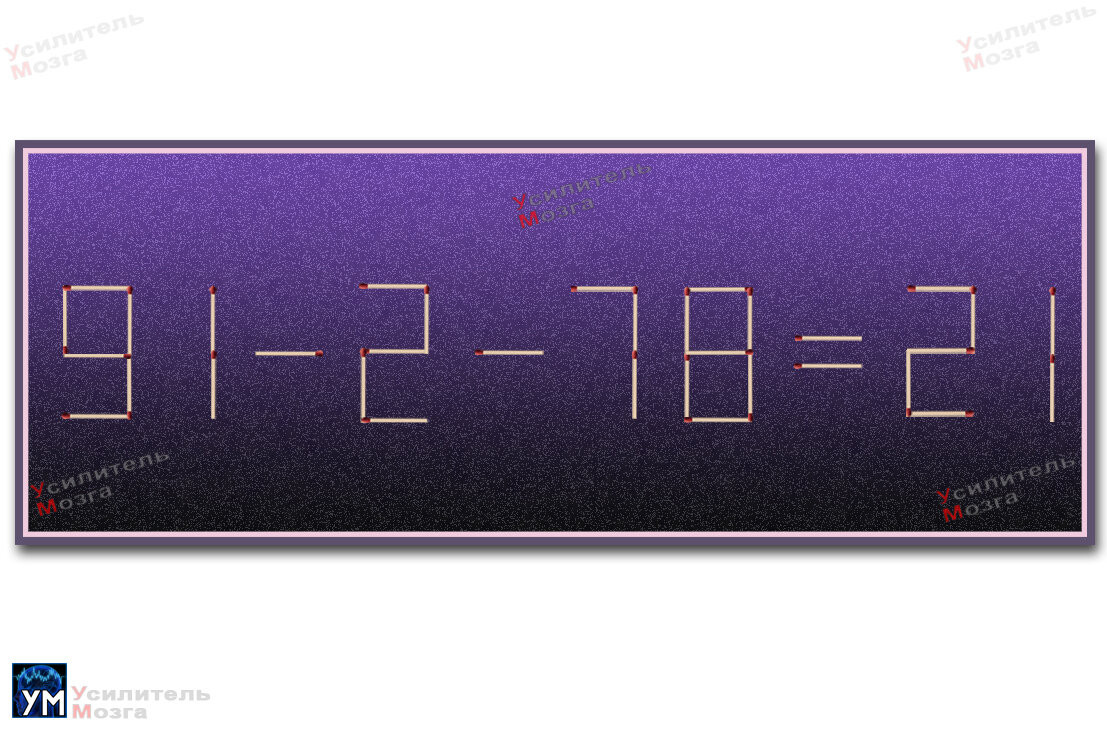 Итак, рассмотрите составленное из спичек равенство: 91-2-78=21. Безусловно, с ним что-то не так. Ваша задача — найти решение и переставить две спички таким образом, чтобы можно было правильно решить пример.
