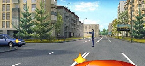 При этом имеется 3 варианта ответа: проедете перекрёсток первым; развернётесь, уступив дорогу легковушке; подождёте, когда регулировщик опустит правую руку. Не торопитесь, внимательно рассмотрите иллюстрацию и хорошо подумайте.