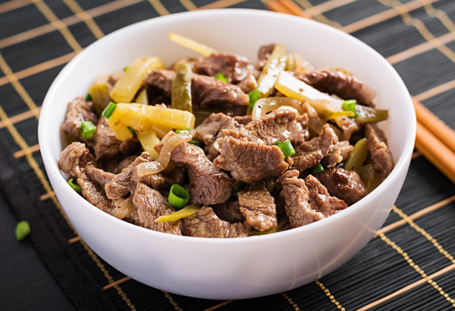 Отвариваем говядину в течение 2 часов, охлаждаем и нарезаем на толстые куски. Выложим в глубокую миску. Порежем сладкий перец соломкой, острый — кольцами, положим к мясу. Режем помидоры крупными дольками, лук — перьями.