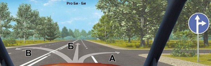 Итак, посмотрев иллюстрацию, мы видим 3 направления. Кроме того, есть установленный знак «Движение прямо и направо». Если поехать в направлении Б, мы не будем противоречить знаку.