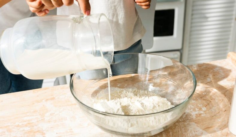 Нагреваем воду, добавляем дрожжи и сахар. Добавляем масло и перемешиваем. Соединяем муку и воду, нагреваем на водяной бане. Тесто должно загустеть. Положим в молоко сливки, соль. Смешиваем с помощью миксера тесто с дрожжами и вымешиваем.