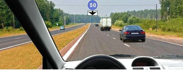 Кроме того, поскольку мы едем по левой полосе, можно выполнить опережение. Также мы видим знак, указывающий на скорость, которая разрешена на этой полосе — не менее 50 км/ч.