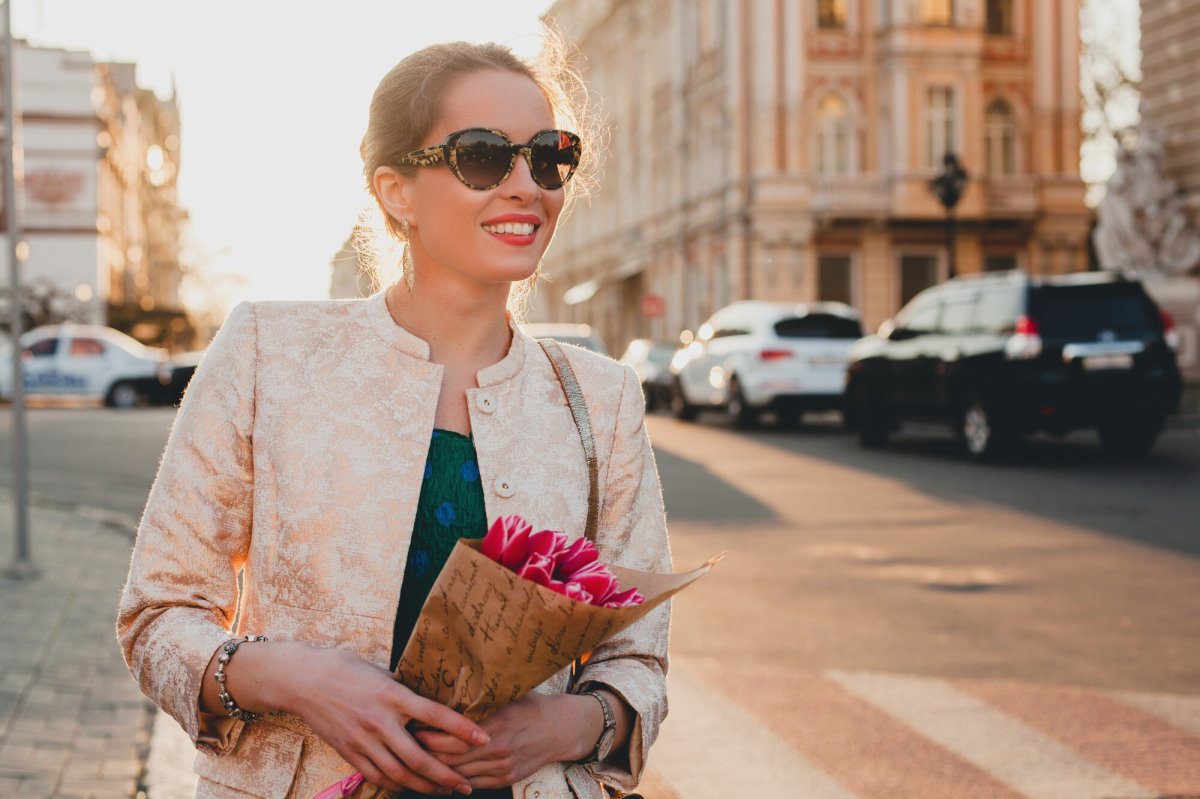 После 50 яркие цвета не просто допустимы — они необходимы! Ключевой момент — удачный фон, например, белая рубашка. Дополним образ нейтральными сандалиями, сумкой в сдержанных тонах и очками с необычной оправой. Можно разбавить его золотистыми акцентами.