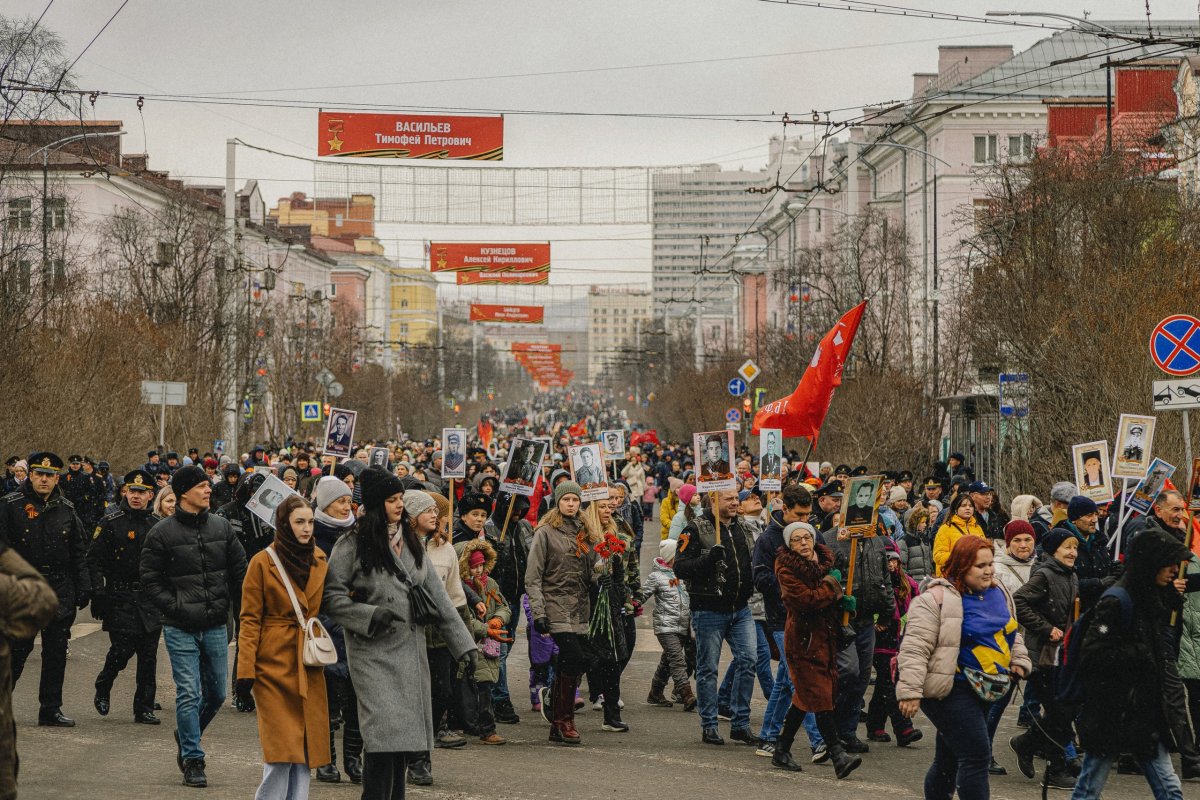В 10:40 от площади Пять Углов стартует шествие "Бессмертного полка". Участники пройдут до мемориального комплекса "Защитникам Советского Заполярья в годы Великой Отечественной войны".