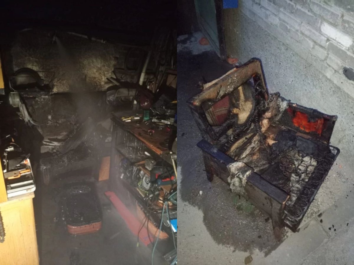 В результате пожара в подвале огнём уничтожено кресло, повреждена мебель и предметы обихода.Для вскрытия дверей подвала спасателям пришлось использовать бензорез.