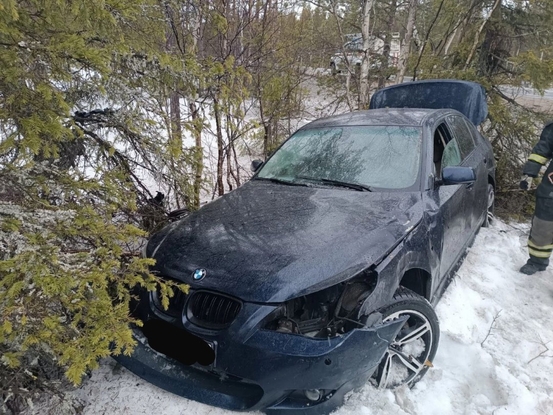 В субботу на 7 км автоподъезда к Апатитам произошло ДТП. Автомобиль BMW 530 съехал в кювет и опрокинулся на бок.