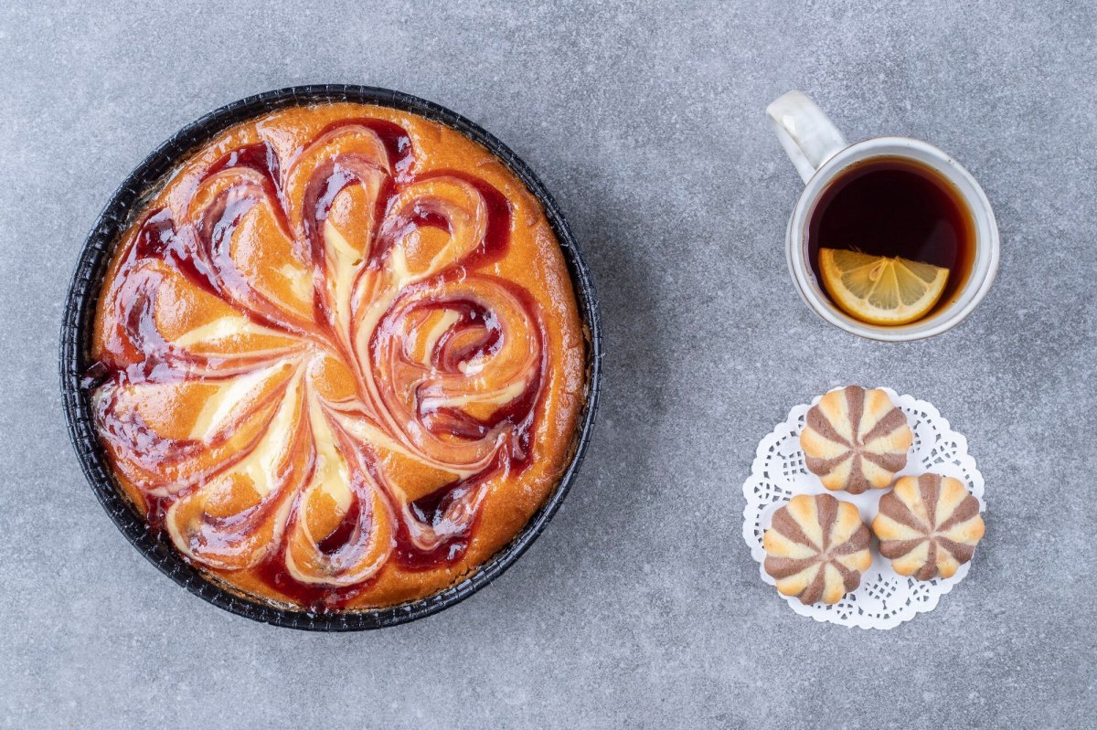 Когда пирог остынет, его нужно достать из формы и произвольно тонкой струйкой нанести глазурь. Такой пирог не стыдно поставить на стол даже на семейный праздник. Это очень вкусно и необычно. Обязательно попробуйте!