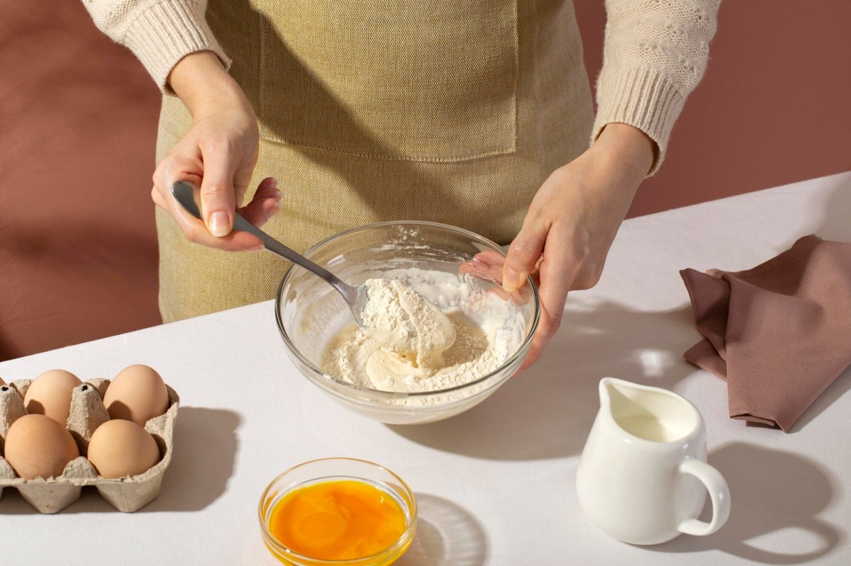 Три яйца нужно взбить, добавив к ним немножко соли и ванилина, а после постепенно ввести 200 граммов сахара. Масса должна быть светлой и увеличиться в объеме. В смесь добавить 75 граммов растопленного, но при этом не горячего сливочного масла и 150 граммов сметаны, а после того как эти ингредиенты будут перемешаны, ввести муку, соединенную с разрыхлителем. Нужно действовать миксером, включенным на самую маленькую мощность.