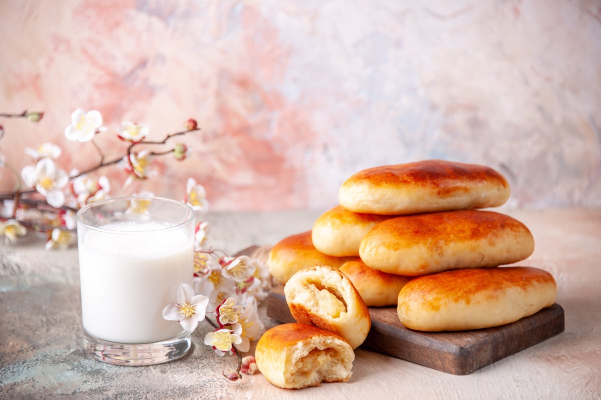 Готовое тесто раскатайте в толстый жгут и поделите на 11 кусочков. Раскатайте каждый в лепешку и выложите в середину 1 ложку начинки, например, творога или яблок с сахаром. Защипните края пирожков и выложите их на застеленный пергаментом противень швом вниз. Смажьте пирожки взбитым желтком. Отправьте противень в разогретую до 200°С духовку и выпекайте 25 минут.