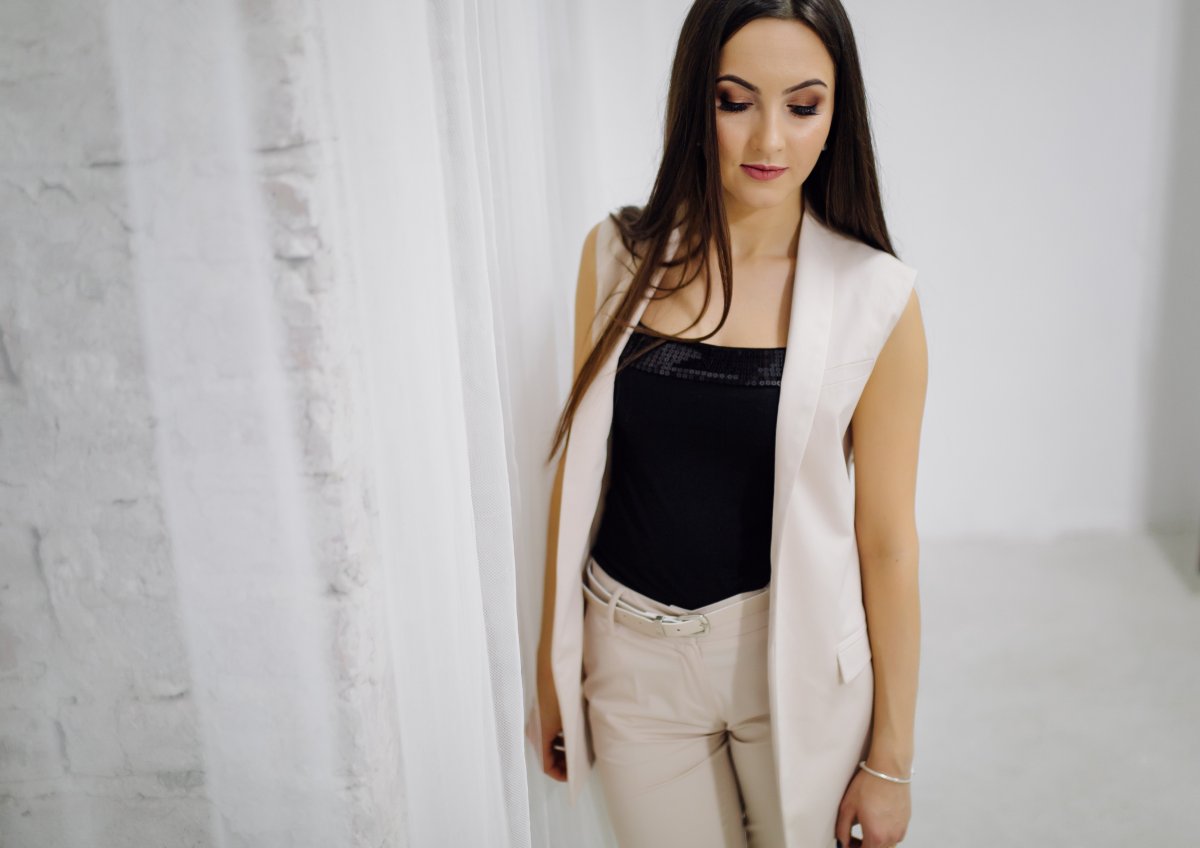 К жилетке можем добавить брюки, стараемся выбрать все одного цвета или хотя бы одних оттенков. Брюки подбираем с широким силуэтом или клеш.