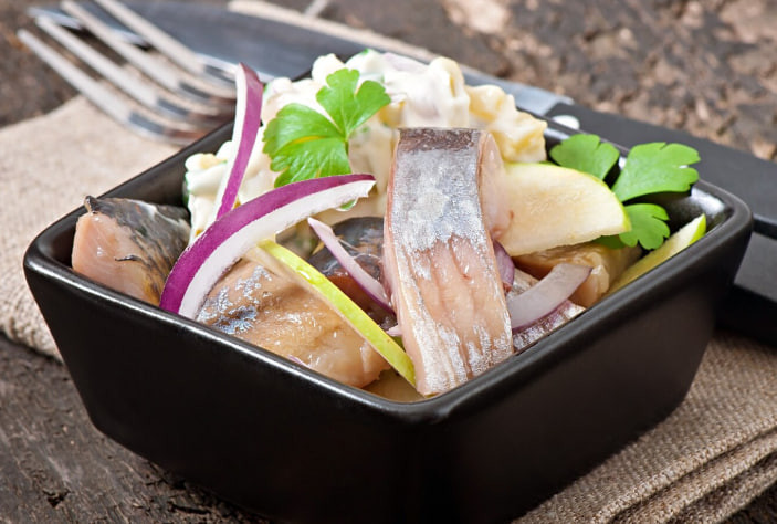 Итак, сначала порежем луковицу кубиками, немного примнём, положим сахар и яблочный уксус. Перемешиваем и оставляем мариноваться. Слабосолёную сельдь отделяем от косточек, режем филе кубиками. Нарезаем помидоры и убираем лишний сок с помощью дуршлага.