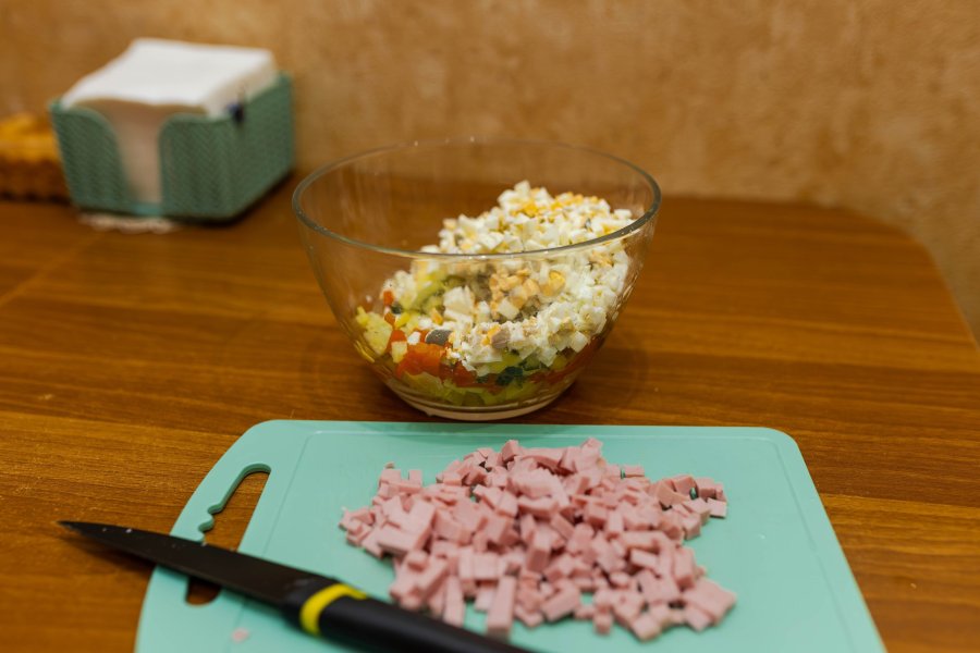 Для расчёта был взят следующий рецепт: 500 граммов варёной колбасы, 400 граммов картофеля, 300 граммов огурцов, пять яиц, 100 граммов свежей зелени, 300 граммов сметаны и 1 килограмм кисломолочного продукта (кефир, айран и т.п.).