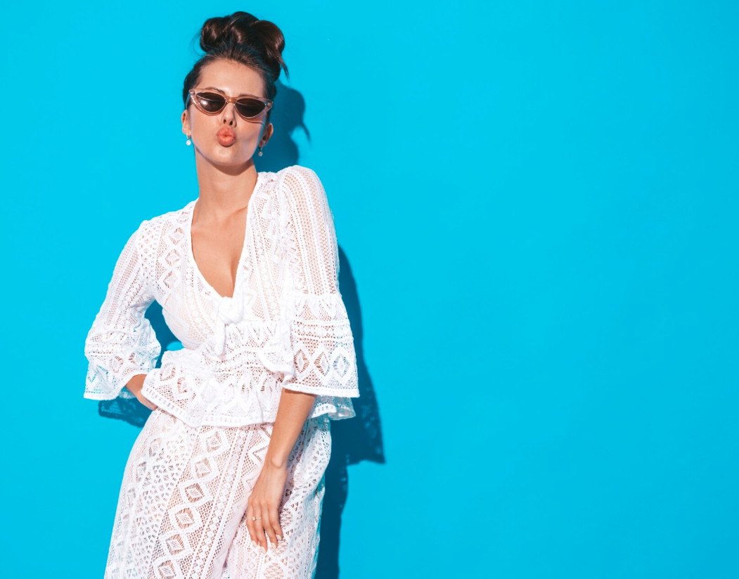 Отдельно можно сказать о костюме, который должен быть у каждой модницы: белое кимоно с широким поясом и брюки палаццо. Кимоно можно надеть на контрастный топ, а можно на белье. Разбавит образ в качестве интересного цветового пятна необычная сумка, очки и шляпа.
