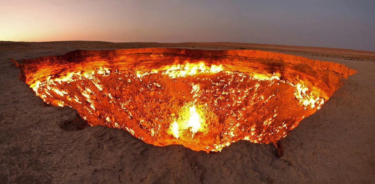 Для сведения: Этот провал шириной 70 м и глубиной 30 м в пустыне Каракумы стал известен как «Сияние Каракумов», но местные жители называют его «Вратами ада». Непотухающий на протяжении десятилетий огонь, возникший в результате человеческой ошибки, стал настоящей экологической катастрофой не только для Туркменистана, на территории которого находится.