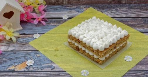 Возьмите большую тарелку или поднос, выложите на него крем и разровняйте его лопаткой. Затем уберите торт на ночь в холодильник, чтобы он хорошо пропитался.
