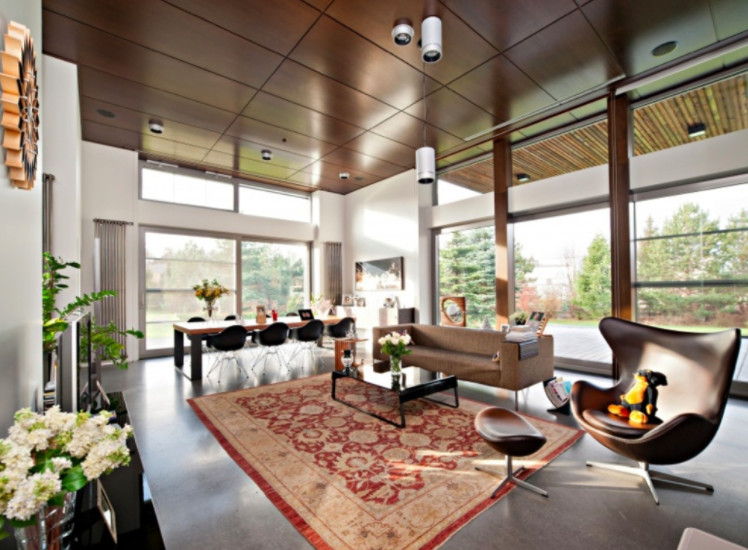 Внутри дом отделан роскошно, но при этом современно. Хай-тек, классика, арт-деко — эти стили можно усмотреть в убранстве дома. Мебель — не просто дорогая, она максимально удобная и прекрасно вписывается в интерьеры помещений, выполнена из премиум-материалов. В целом жилище обладает своей особой атмосферой, которую постарались создать дизайнеры. Воздух и свет циркулируют в комнатах, наполняют их — за это отвечают панорамные окна.