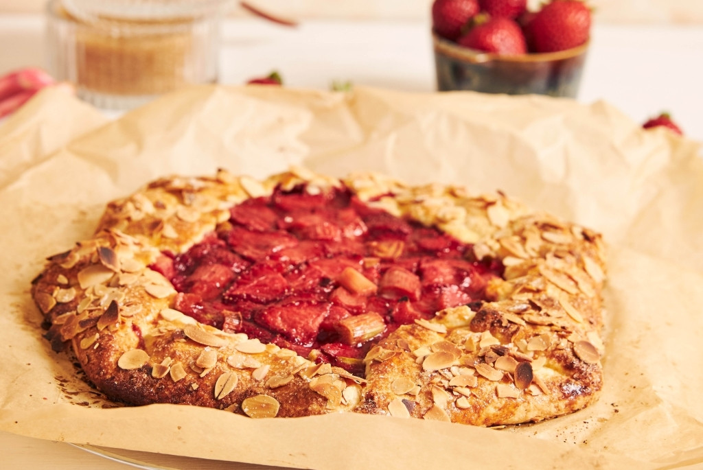 Противень размером примерно 25×30 см застилаем бумагой для выпечки и выкладываем на него половину теста, равномерно распределяя его по всей поверхности. На него раскладываем 500 граммов клубники (срезом вверх), посыпаем её столовой ложкой кукурузного крахмала и накрываем второй половиной теста. Сверху выкладываем 250 граммов клубники (по желанию можно посыпать пирог миндальными лепестками — это придаст дополнительную хрустящую нотку и изысканный вкус).