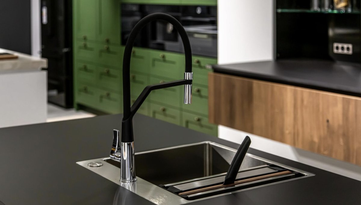 Сложные смесители с гибкими изливами смотрятся, конечно, эффектно, однако не пройдёт и нескольких месяцев, как такое приспособление начнёт течь и перестанет держать свою форму. Лучше взять обычный смеситель с выдвижным душем — он будет куда надёжнее.