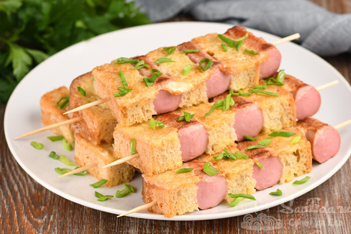 Разрежьте 2 ломтика хлеба и 6 сосисок на 3 части. Чередуйте хлеб и сосиску на шпажке.