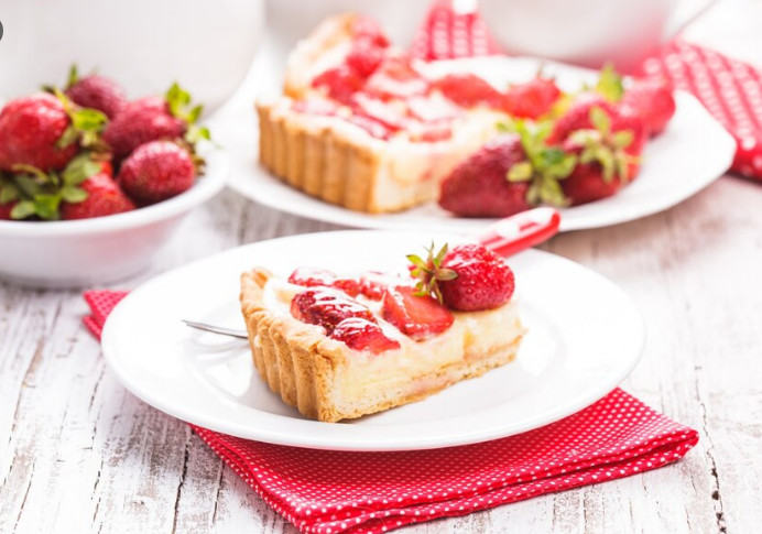 Готовое тесто выливаем в форму (диаметром 25-26 см), сверху выкладываем начинку, а на неё — клубнику.