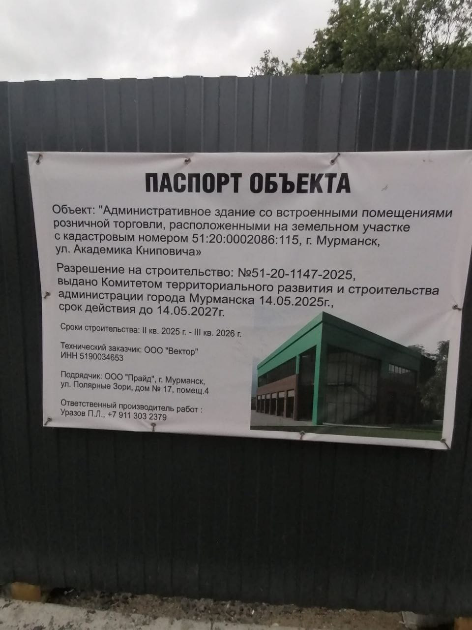 Строительство здания началось в районе улицы Книповича недалеко от супермаркета в Мурманске. На заборе, огораживающем стройку, висит паспорт объекта.