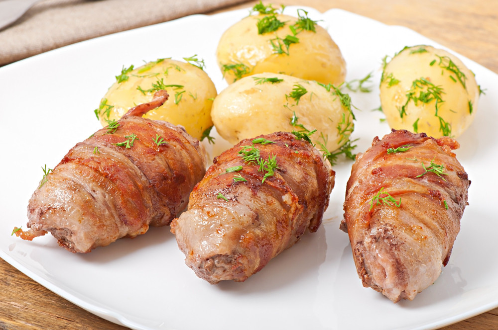 Ингредиенты: 9 молодых картофелин, 9 ломтиков варёно-копчёного бекона, 4 чеснока, соль, перец, травы по вкусу.