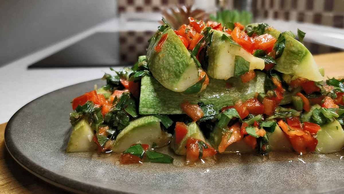 Пока кабачки отдыхают, мелко нарезать 300 грамм красного болгарского перца, смешать его с петрушкой, чесноком, половинкой чайной ложки соли, перцем. Добавит 2 столовых ложки уксуса и одну меда или сахара.