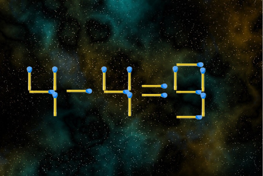 Внимание на иллюстрацию, перед вами каверзная головоломка. В равенстве «4-4=9» намеренно допущена ошибка, постарайтесь исправить запись, переместив только одну спичку. Остальные элементы сдвигать не разрешается, все строго.