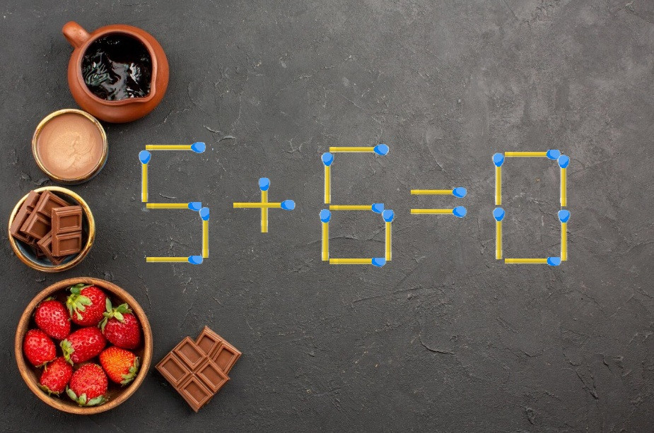 Взгляните на иллюстрацию, перед вами спичечное равенство. В примере «5+6=0» явно допущена ошибка. Исправьте равенство, переставив всего одну спичку.